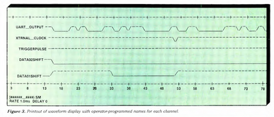 When the logic analyzer is properly connected and the trigger is programmed, the operator pushes "G" to begin capturing the data. As soon as the trigger occurs, and 1,000 samples have been collected, the logic analyzer displays the DUT waveforms. The names option permits the operator to create individual names to identify each line of data. The displayed waveforms can be printed for later examination, as shown in Figure 3. A movable cursor permits scrolling through the data. You can calculate the timing intervals between signals by using the calculate command.