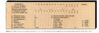 The trigger setup panel, shown in Figure 2, provides 15 triggering categories, with multiple choices available within each category. When using the analyzer, you can call up onto the video display detailed explanations about each of the 15 categories by pushing the "?" key and the category number. This self instruction feature helps you get quickly into actual circuit analysis.