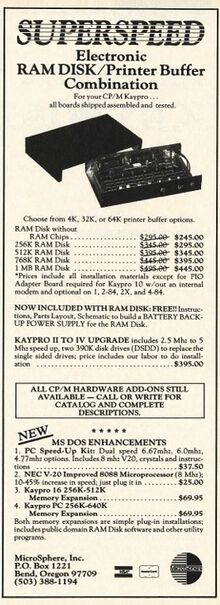 [[File:Microsphere ramdisk ad.png|400px]]<br>(Profiles, December 1985) | [[File:Microsphere ramdisk ad.png|400px]]<br>(Profiles, December 1985) | ||